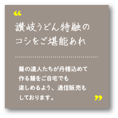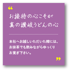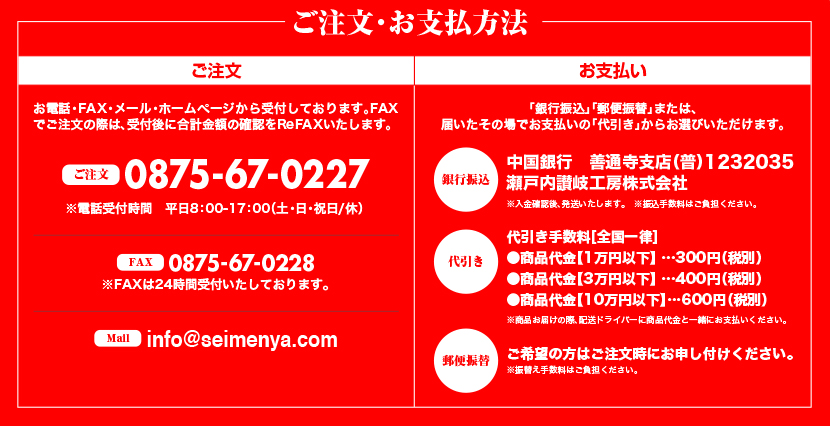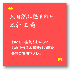 | 工場所在地 | 【財田製麺工場/直売所】 〒769-0401 香川県三豊市財田町財田上6373-1 TEL:0875-67-0227 FAX:0875-67-0228 |